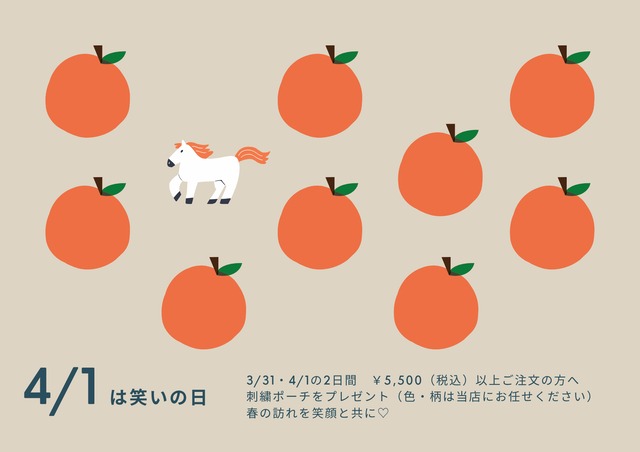 4/1はエイプリールフールとして知られていますが モンゴルでは笑いの日。 周りの人を笑顔にするユーモアが 織り込まれた日です。 初対面笑わないことの多いモンゴルの方は 私から見るととっても話し好き。 人を笑わせたり喜ばせたりする話し方が とても上手な方が多いなぁと感じています。 そして日本の4月は 始まりの月。 身の回りの物を新調したり 新しい環境にチャレンジしたり 気持ちを新たに進む方も多いかと思います。 当店でウフフと笑いを誘うのは 刺繍グループの女性たちが届けてくれる商品。 家畜と子どもたちの あたたかで素朴な図柄が人気です。 3/31-4/1 税込5,500円以上お買い上げの方に 当店より刺繍ポーチをお付けしてお届け致します。 色・柄はお任せとなりますが リップやイヤホンなど かばんの中で迷子になりやすいものを入れるのに 良いサイズのものをお送り致します。 どうぞ楽しみにお待ちください。 不要な方もいらっしゃると思いますので その場合はお手数ですが 別途お知らせいただければと思います。