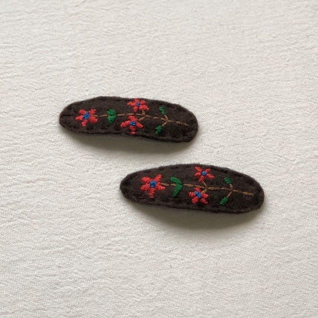 小さい頃 お気に入りの髪留めがあった事を ふと思い出すような 可愛いヘアピンです。 フェルトにあしらわれた 小さな花々。 お子様のお顔周りを 明るくしてくれると思います。 2個セットでの販売です。 長さ 約7.5cm 幅 約2.3-2.5cm